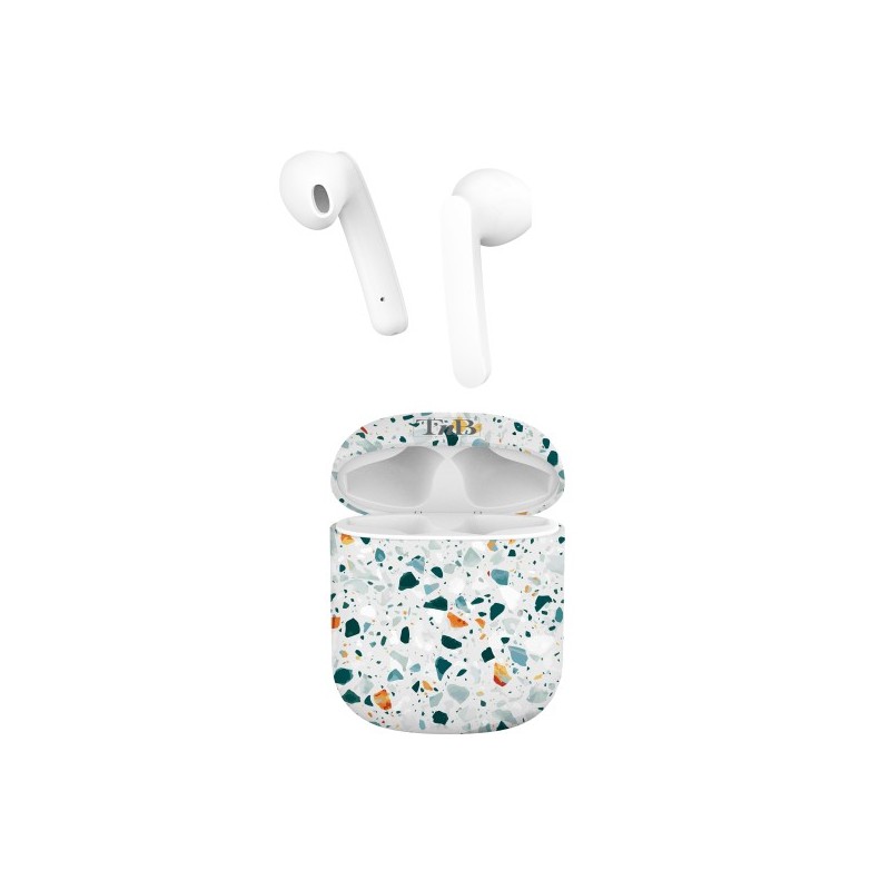Auricolari/microfono BT, bianchi, con custodia in 2 disegni trendy giovani e FUN.