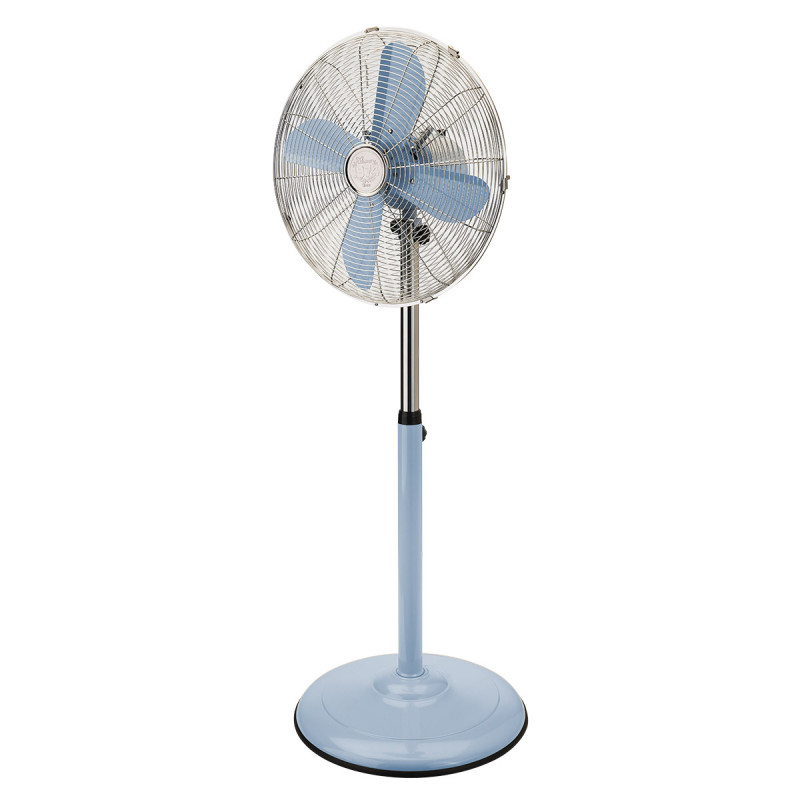 "Ventilatore a piantana Ø 40cm in metallo, con regolazione di intensità e direzione dell'aria Corpo in metallo verniciato, e con cromature. Selettore 0 / Min / Med / Max. Tasto oscillazione Destra / Sinistra. Inclinazione Alto / Basso regolabile. Altezza regolabile (max 123cm). Elica in metallo Ø 40cm. Griglia di protezione con maniglia per presa. 220-240V~ 50/60Hz "