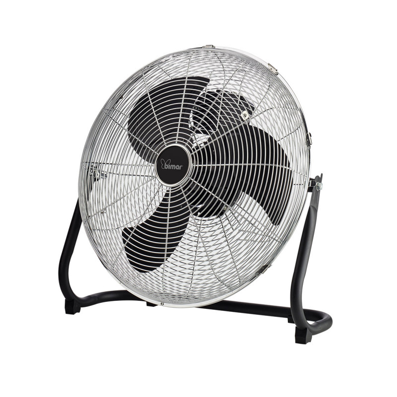"Ventilatore alta velocità da pavimento e muro Ø45cm. Unità ventilante girevole (90°). Motore a induzione 100W. 3 velocità: Min/Med/Max. Elica Ø43cm con 3 pale in alluminio. Griglia di protezione in metallo. Maniglia per presa. Clips avvolgicavo. Kit per fissaggio a parete. 220-240V~ 50Hz "