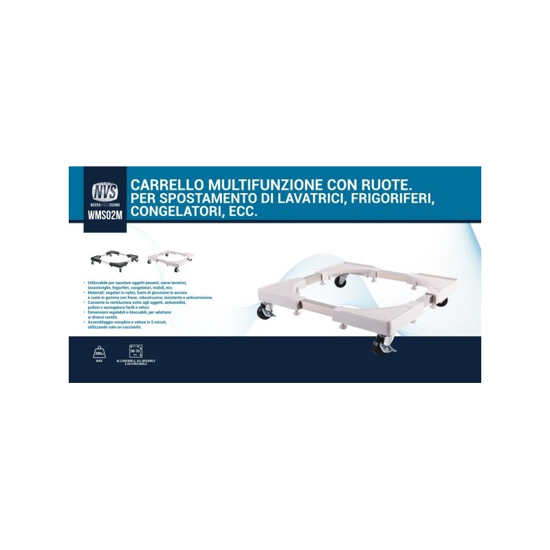 Utilizzabile per spostare oggetti pesanti, come lavatrici, lavastoviglie, frigoriferi, congelatori, mobili, ecc. Materiali: angolari in nylon, barre di giunzione in acciaio e ruote in gomma con freno, robustissimo, resistente e anticorrosione. Consente la ventilazione sotto agli oggetti, antiumidità, pulizia e asciugatura facili e veloci. Dimensioni regolabili e bloccabili, per adattarsi ai diversi carichi. Assemblaggio semplice e veloce in 5 minuti, utilizzando solo un cacciavite. Dimensioni: regolabili 50/70 cm. Peso max: 200 kg.