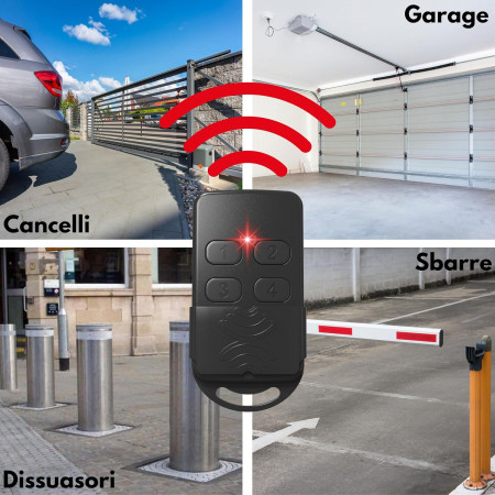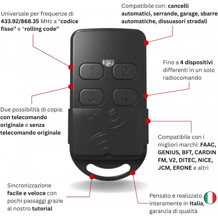 Questo radiocomando è in grado di copiare radiocomandi sia “rolling code” che a “codice fisso” funzionanti con frequenza di: 433,92 / 868.35 MHz