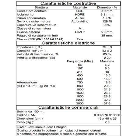 Cavo coassiale TV-SAT in Classe A, con certificazione Eca, Ø 5 mm. Per la distribuzione di segnali TV-SAT, per uso interno in impianti residenziali o artigianali, su distanze medie/basse. Conduttore centrale in CCS con isolamento in HDPE, doppio schermo in Alu-foil e treccia in Alu con schermatura al 95 %, guaina esterna in LSZH* per la massima sicurezza in caso di incendio.